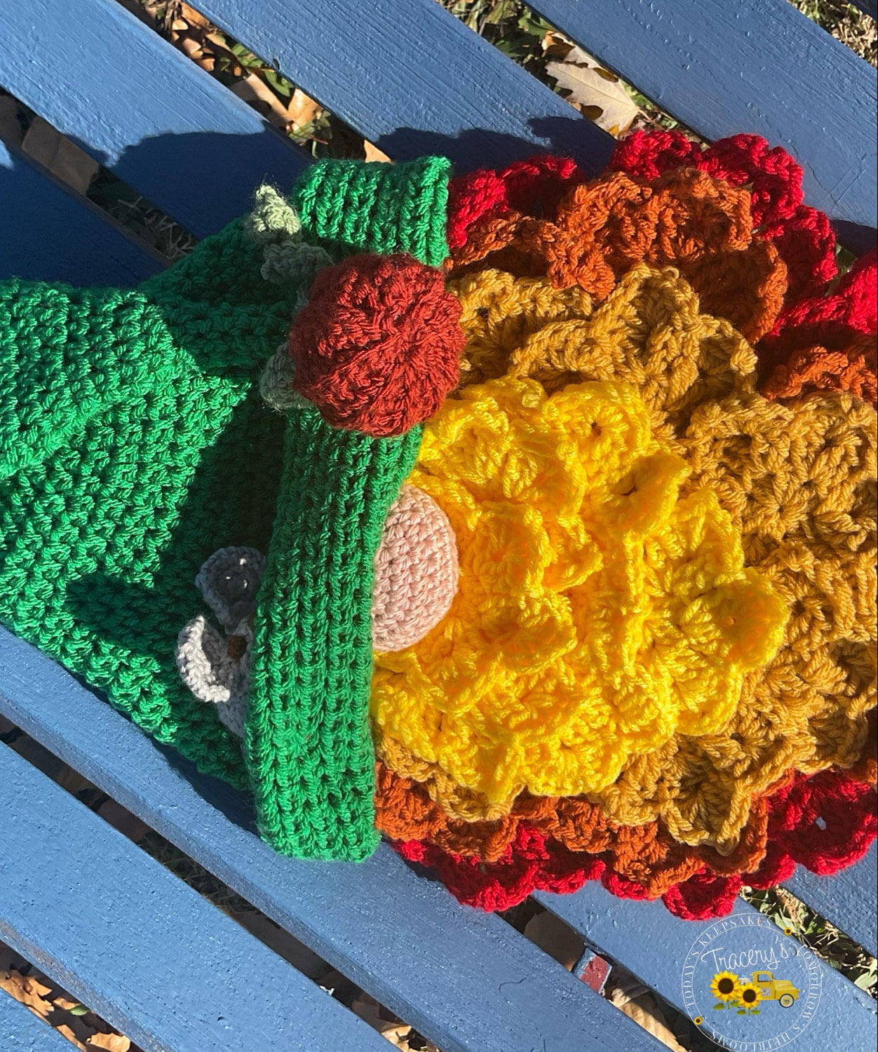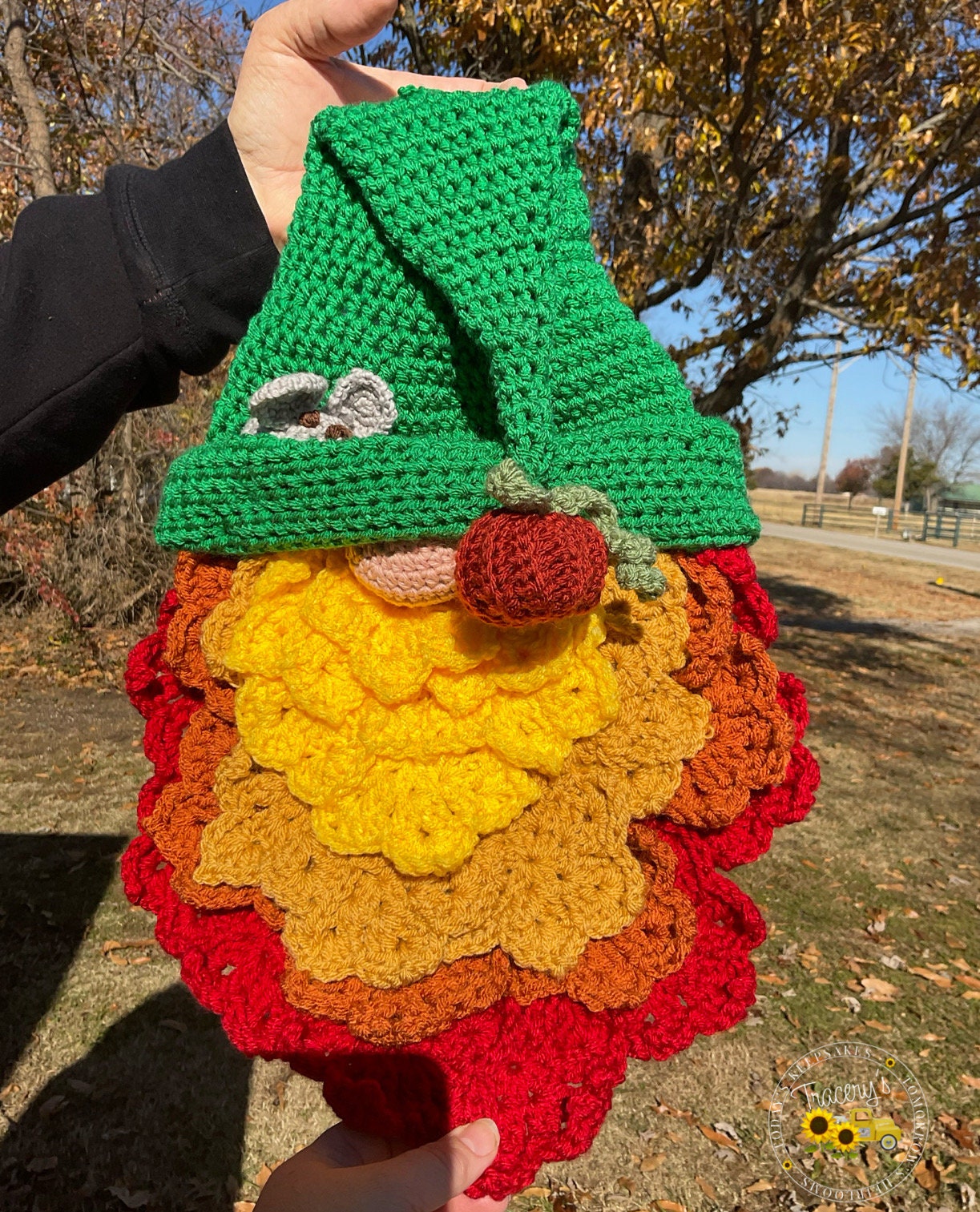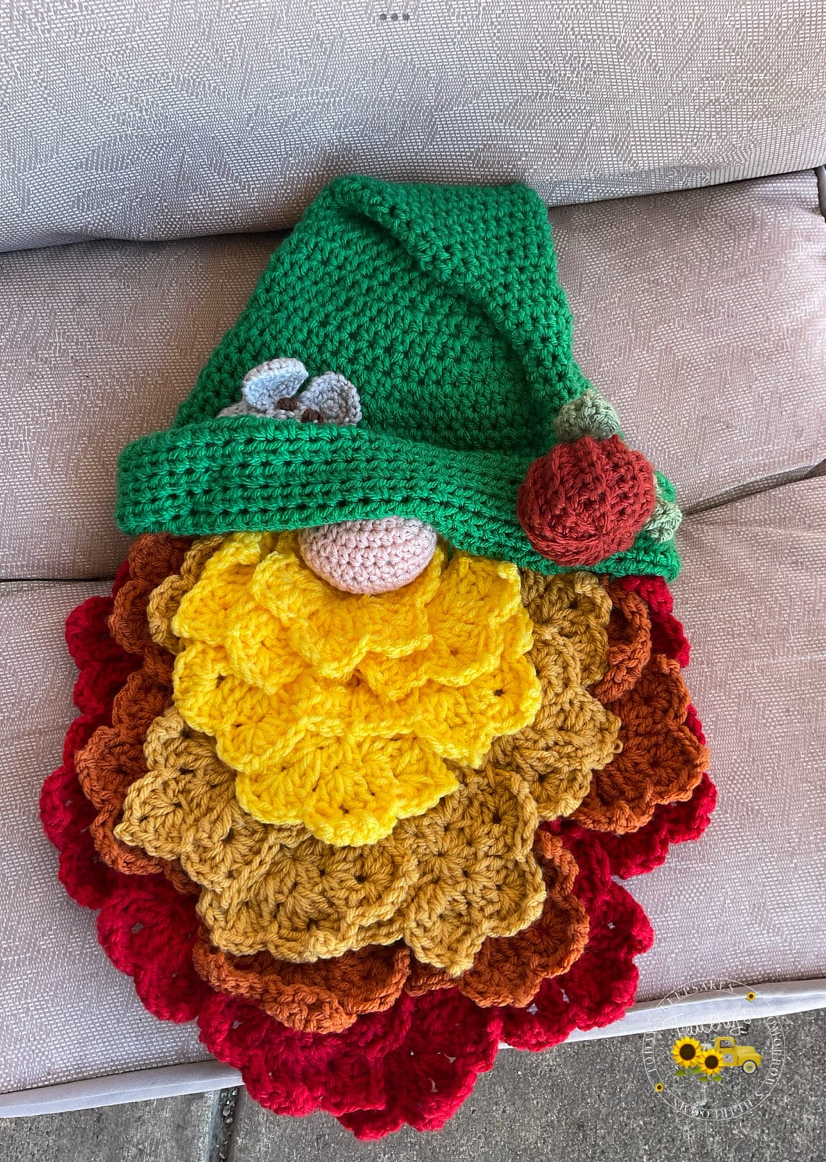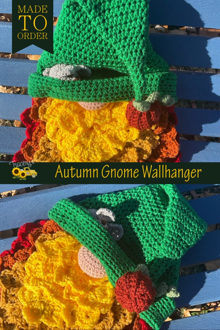 I create these Fall gnome door/wall hangings from scratch. he features a little mouse in the brim of his stocking hat, and a pumpkin on the end his beard is made of leaves all crocheted by me.