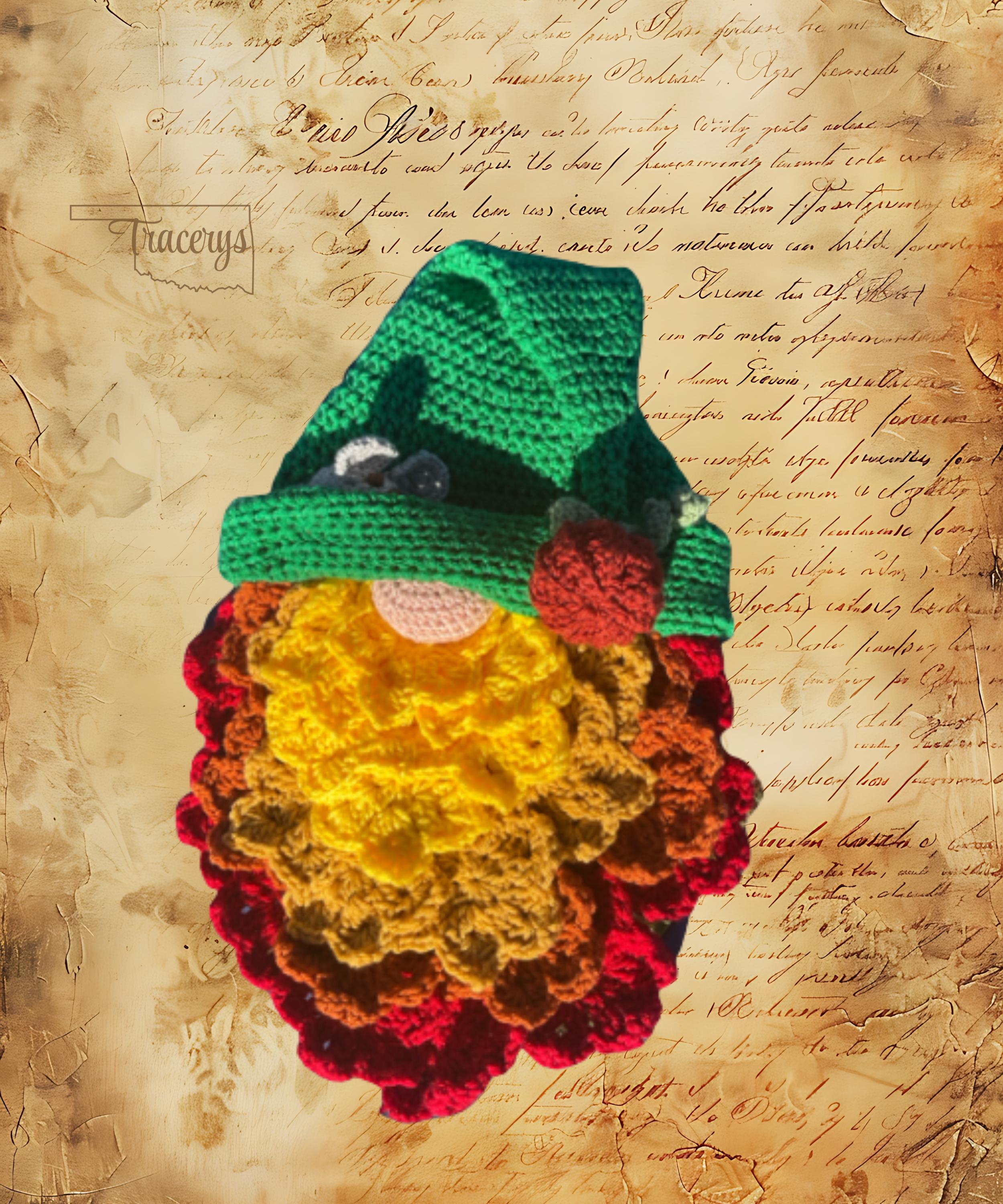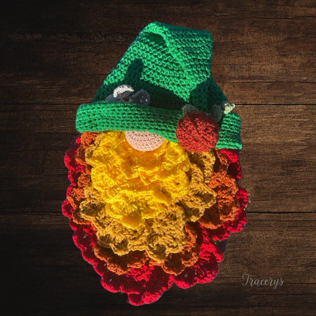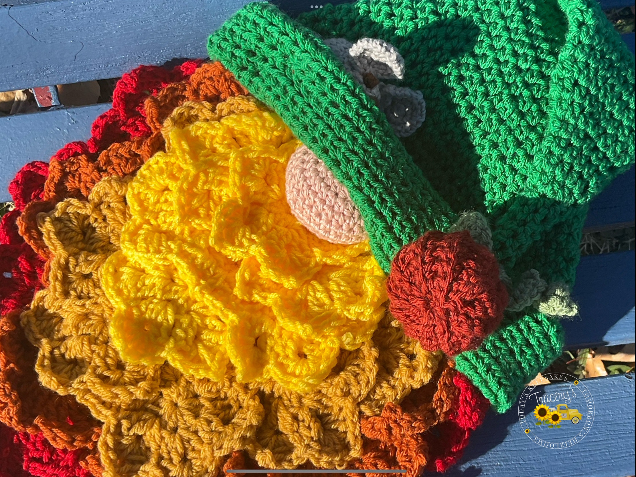 I create these Fall gnome door/wall hangings from scratch. he features a little mouse in the brim of his stocking hat, and a pumpkin on the end his beard is made of leaves all crocheted by me.