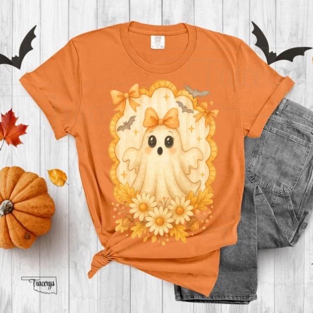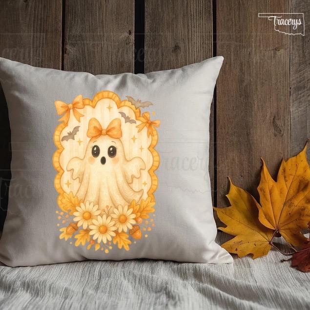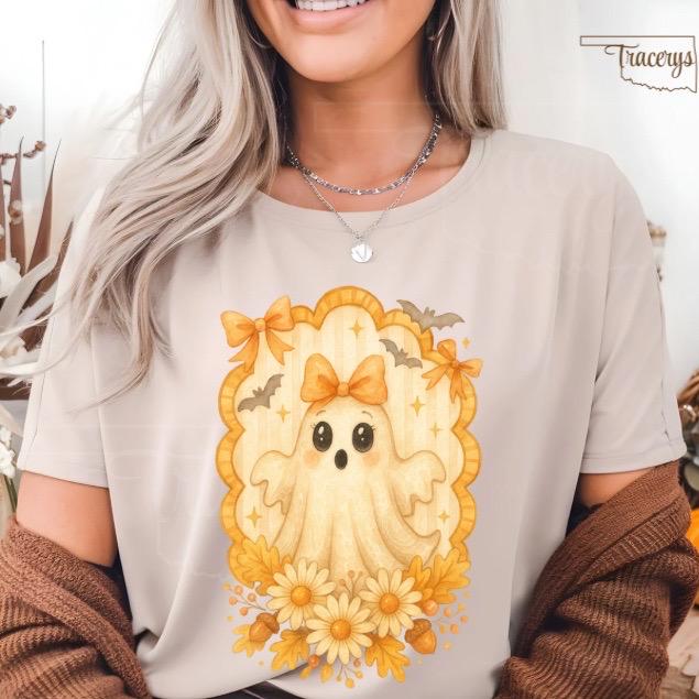 fall ghost png, halloween ghost clipart, autumn ghost design, cute halloween png, cozy fall clipart, daisy halloween png, whimsical ghost art, sublimation halloween design, cottagecore halloween clipart, ghost with bow png, pastel halloween png, fall sublimation design, kawaii halloween ghost