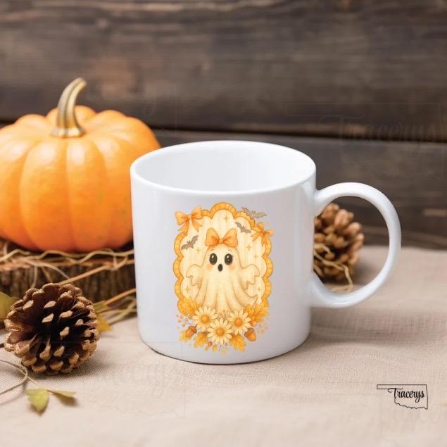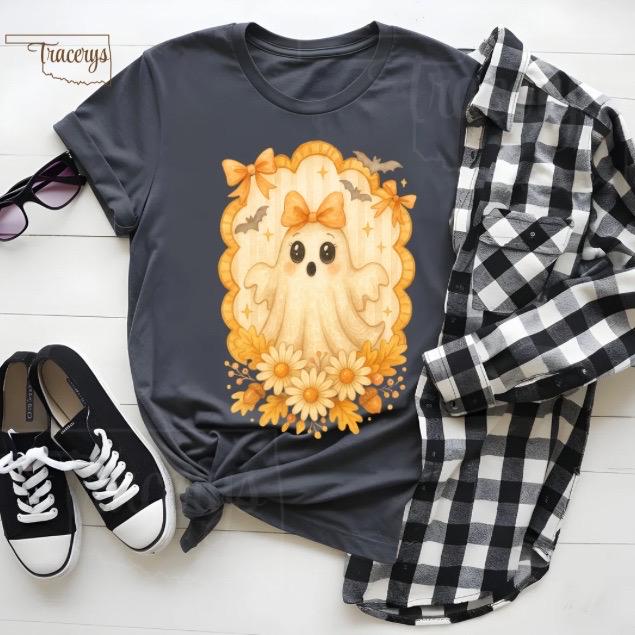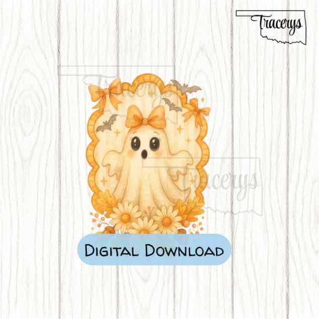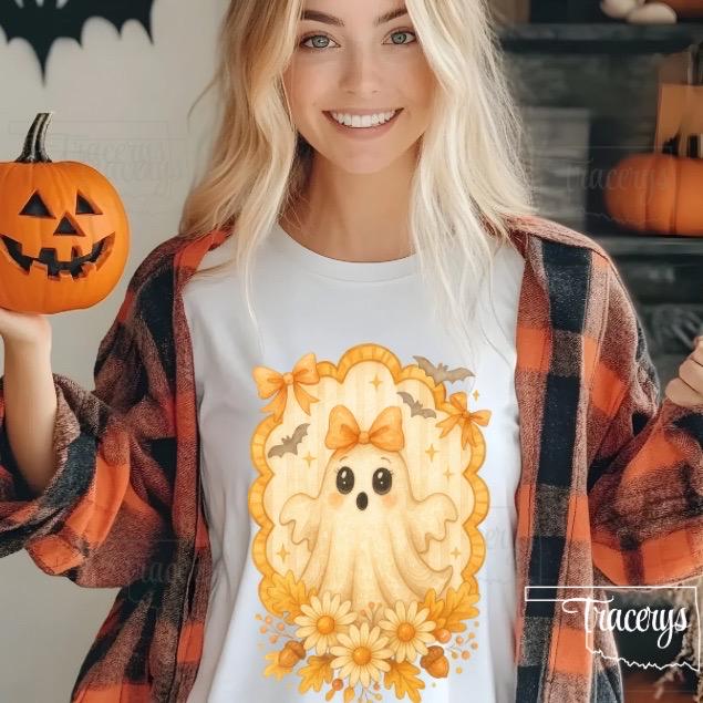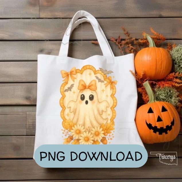 This cute fall ghost with bow PNG is bursting with whimsical Halloween charm! Adorned with a soft orange bow and surrounded by daisies, acorns, and golden autumn leaves, this cozy seasonal clipart is perfect for sublimation, stickers, apparel, planners, and all your DIY Halloween and fall craft projects.