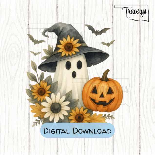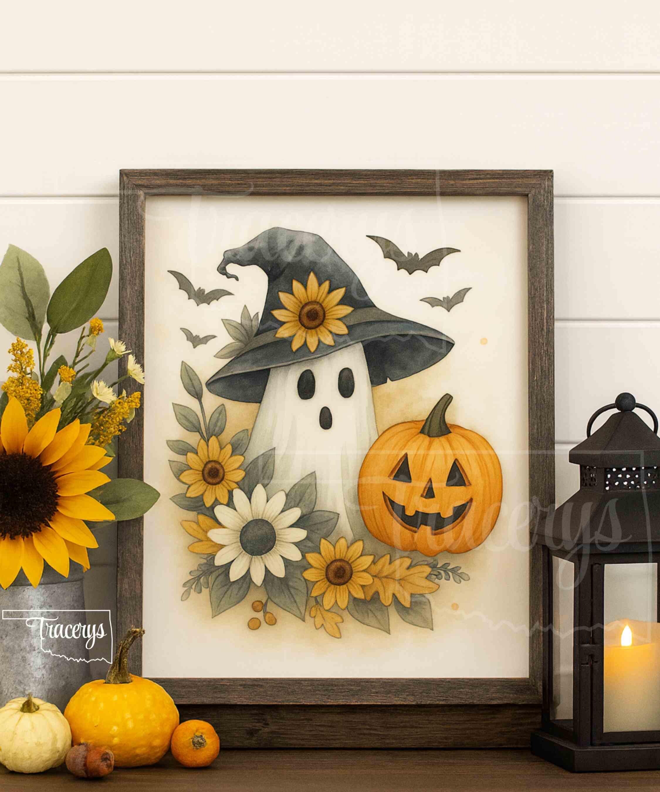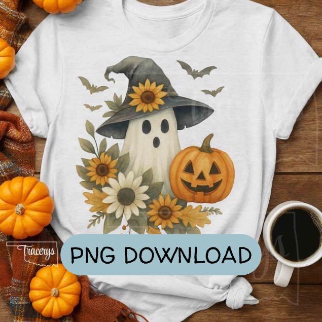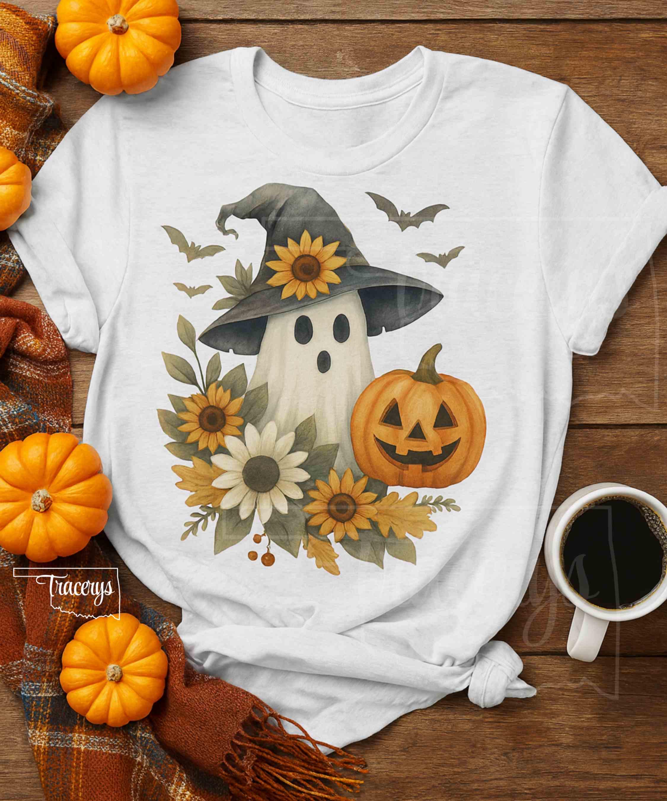 fall ghost png, cute halloween clipart, sunflower witch hat ghost, watercolor pumpkin design, autumn sublimation png, not scary halloween art, cozy fall printable, jack o lantern png, farmhouse halloween decor, seasonal ghost illustration, bat and sunflower halloween art, soft watercolor spooky design