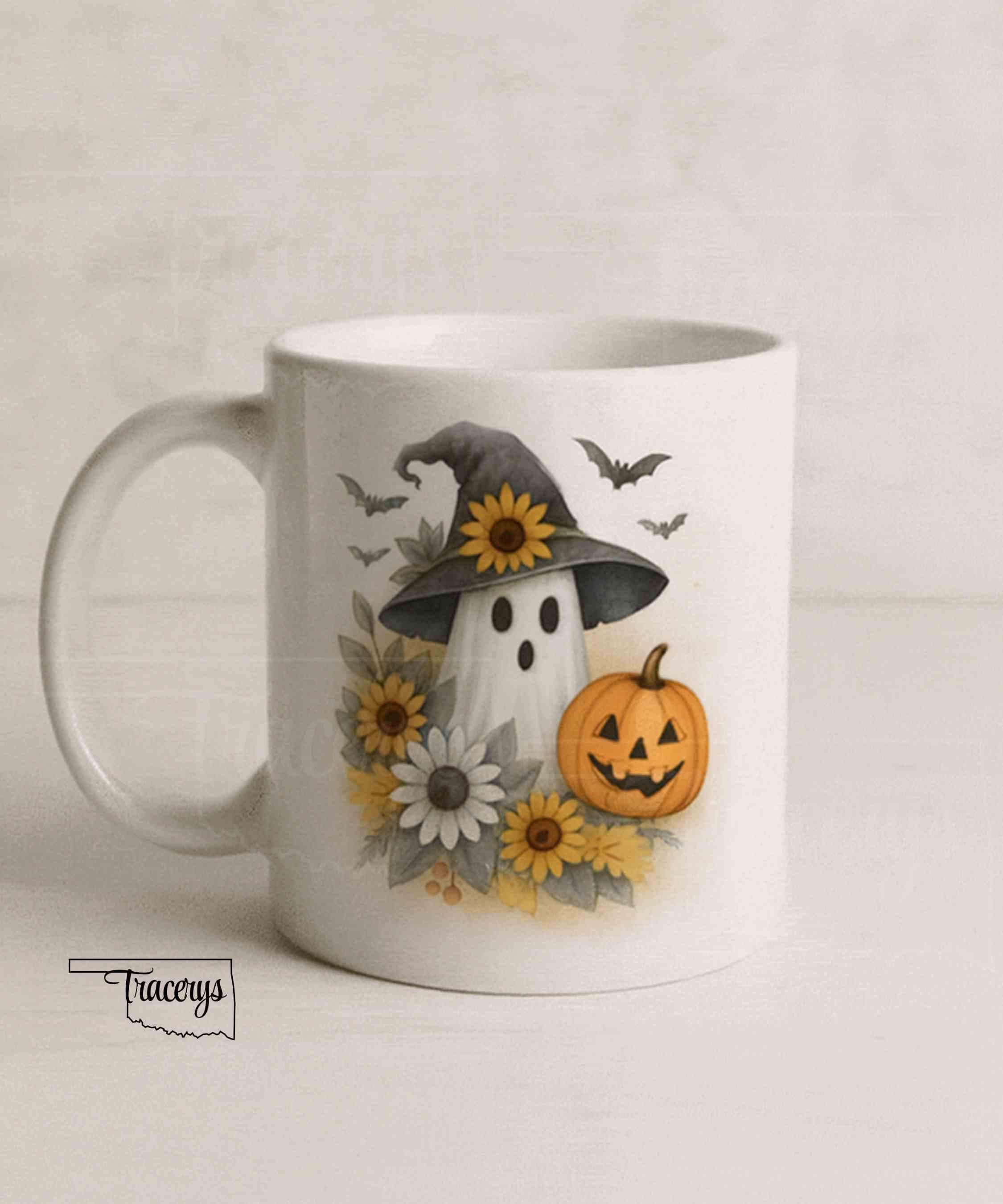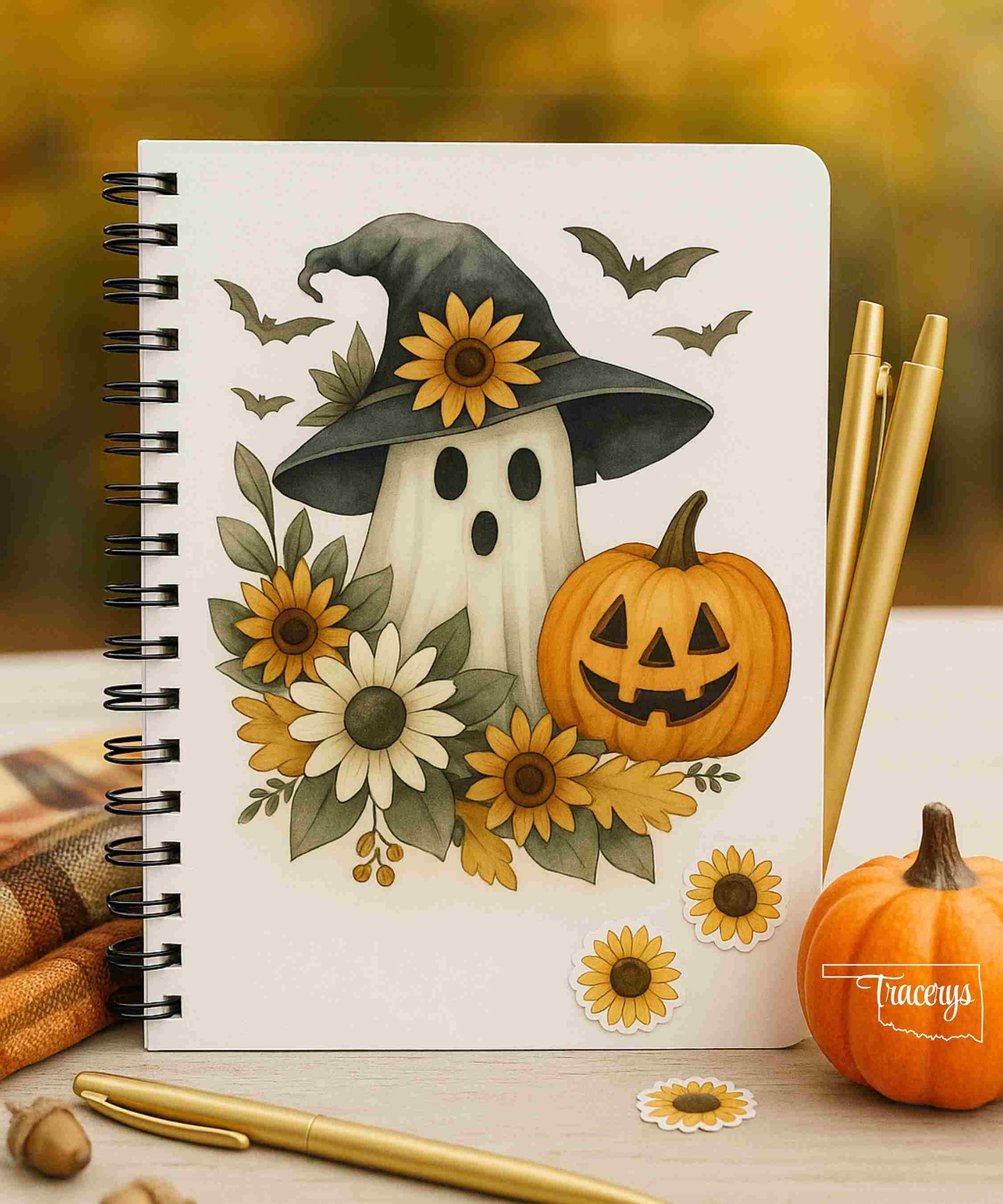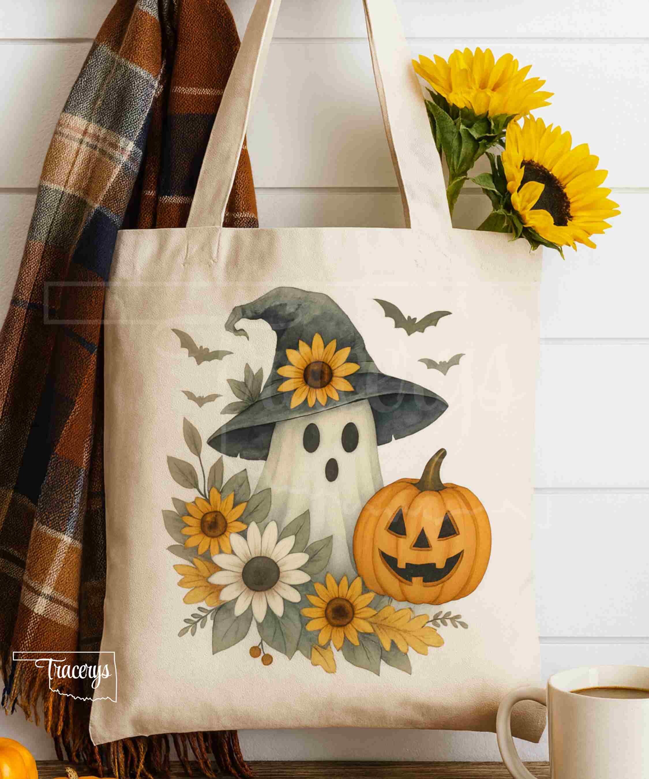 fall ghost png, cute halloween clipart, sunflower witch hat ghost, watercolor pumpkin design, autumn sublimation png, not scary halloween art, cozy fall printable, jack o lantern png, farmhouse halloween decor, seasonal ghost illustration, bat and sunflower halloween art, soft watercolor spooky design