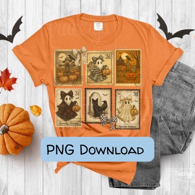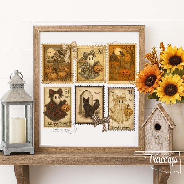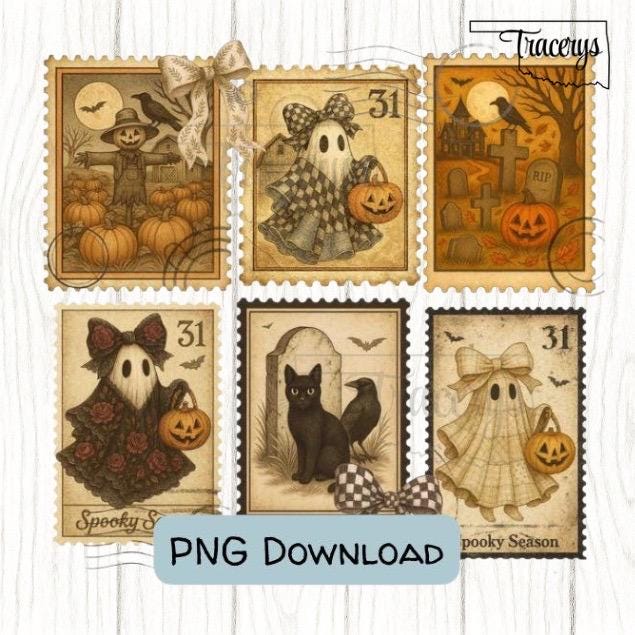 Celebrate spooky season in charming retro style with this high-quality Vintage Halloween Postage Stamp PNG! This digital collage features six beautifully illustrated stamps, each designed with vintage textures, warm fall tones, and iconic Halloween characters-ghosts in patchwork dresses, jack-o’-lanterns, black cats, scarecrows, crows, and haunted graveyards. Perfect for Halloween crafting, sublimation projects, planner stickers, T-shirt designs, and more!