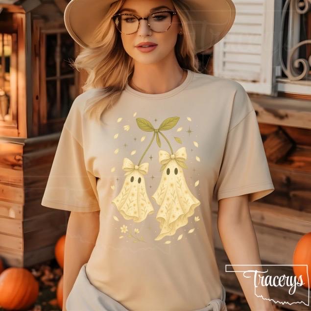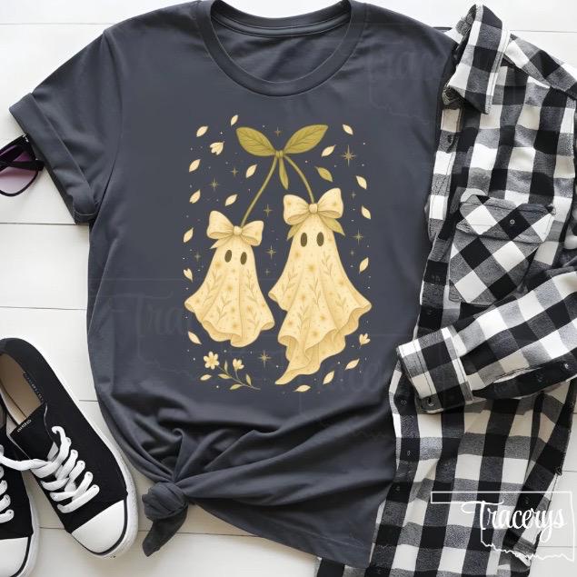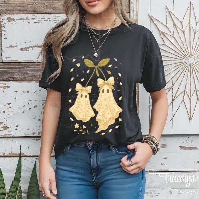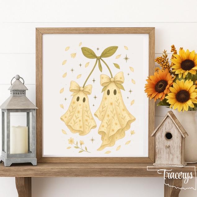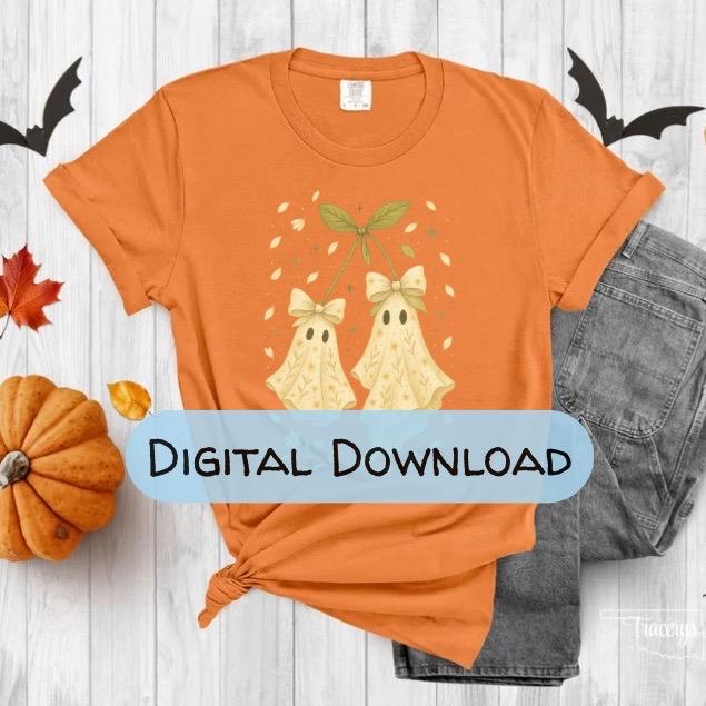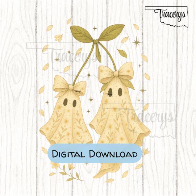 Add a soft, spooky charm to your autumn creations with this hand-drawn Floral Bell Cherry Ghost PNG! Featuring two adorable hanging ghosts shaped like bellflowers, this whimsical design blends Halloween fun with vintage botanical elegance. Each ghost wears a matching bow and is decorated with delicate stars and floral motifs. They’re connected by leafy stems and surrounded by falling leaves and sparkles - perfect for a magical, nature-inspired vibe!
