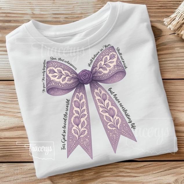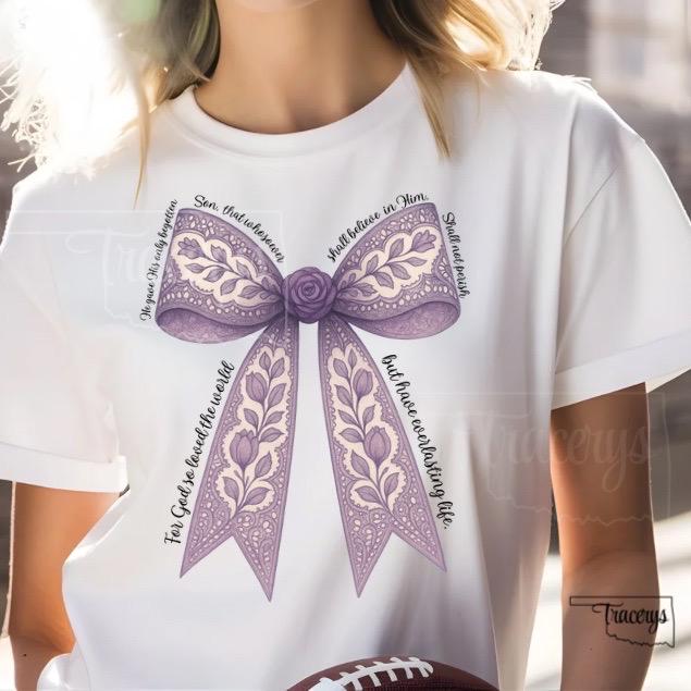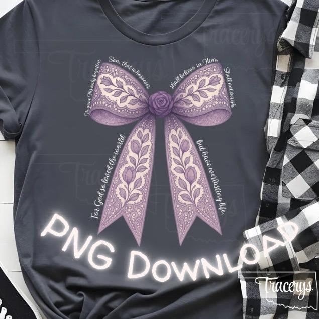 purple lace bow PNG, scripture bow clipart, John 3:16 PNG, Bible verse sublimation, Christian bow design, floral lace bow digital, faith-based clipart, Christian shirt PNG, religious bow clip art, scripture apparel design, floral Christian sublimation, purple bow bible verse, faith bow design, religious gift PNG