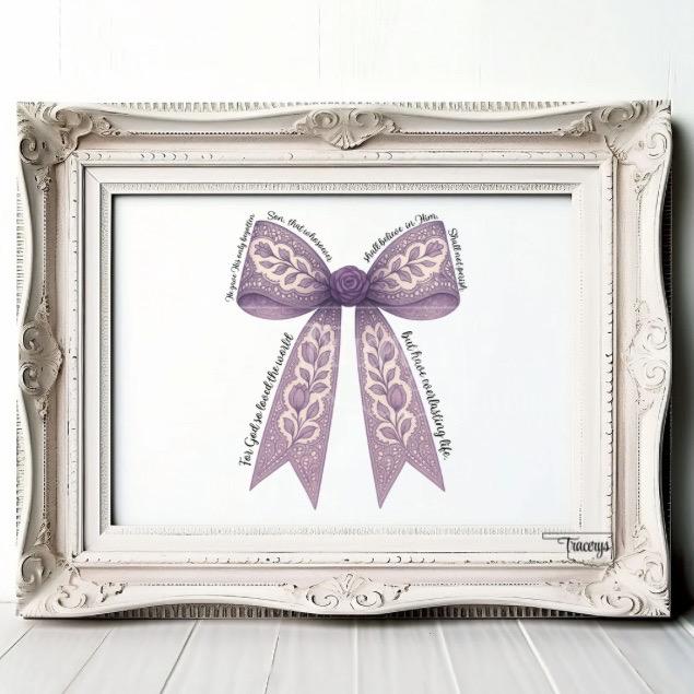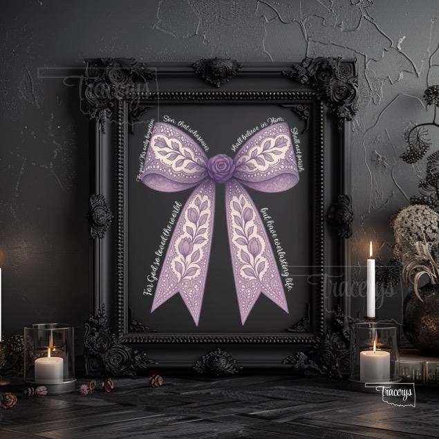 Bring beauty and meaning to your creations with this Purple Lace Scripture Bow PNG featuring the timeless promise of John 3:16:
