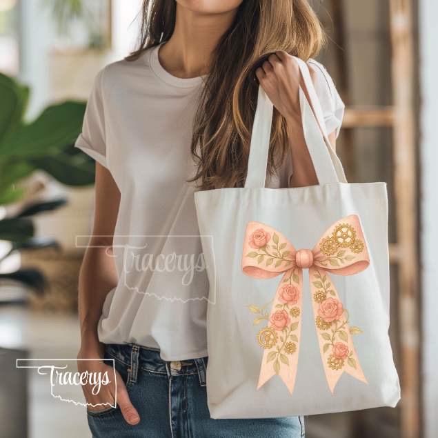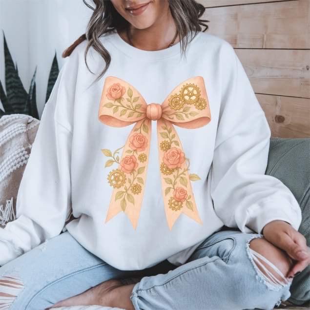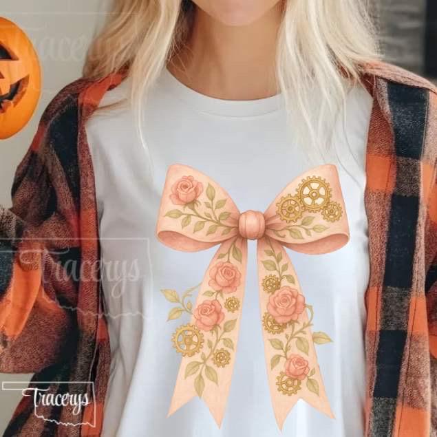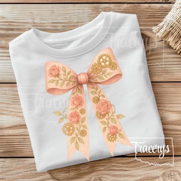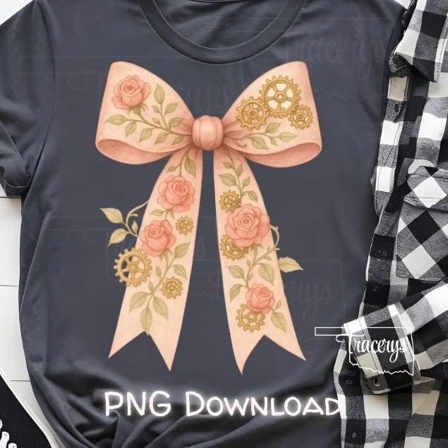 Add a touch of vintage romance to your creative projects with this steampunk rose bow PNG. Featuring soft blush tones, blooming roses, leafy vines, and intricate gold gears, this hand-drawn digital illustration blends feminine elegance with industrial charm.