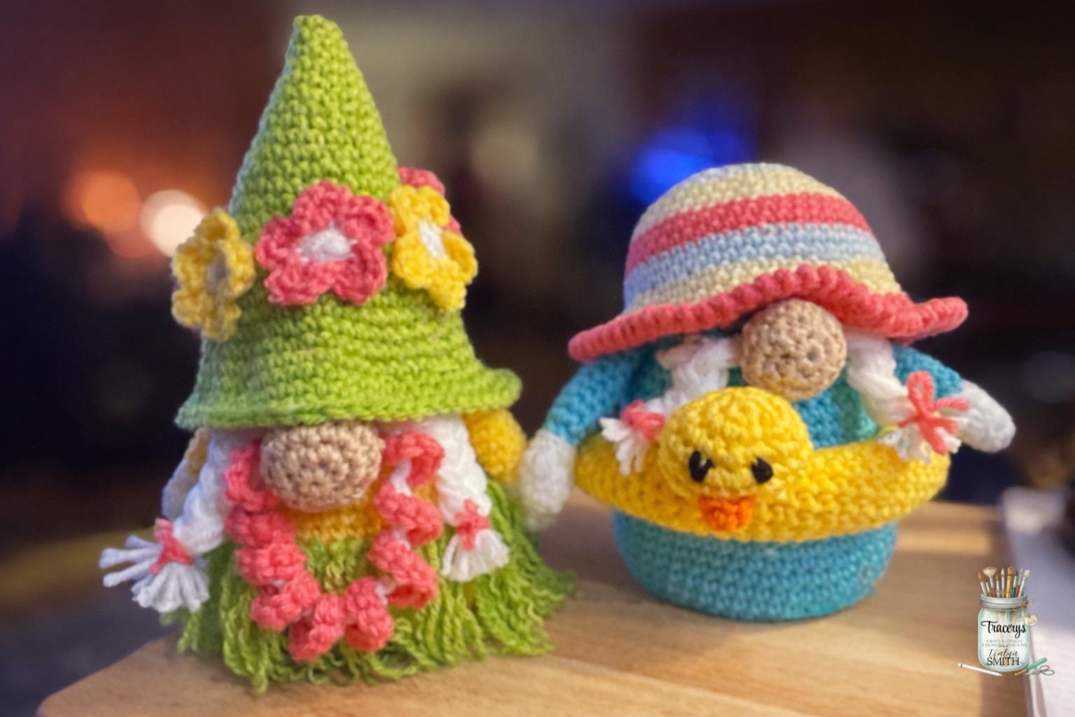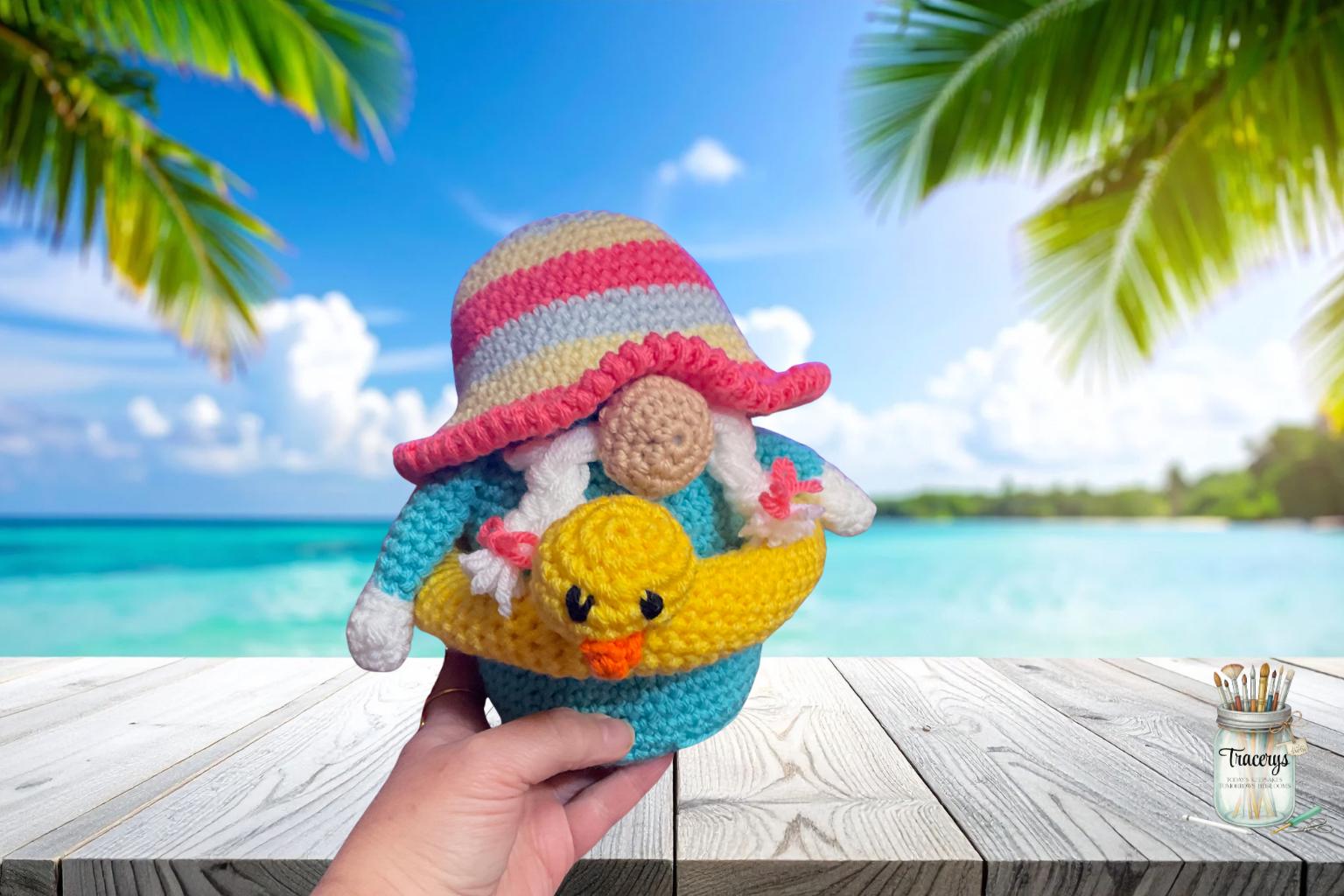 Each gnome is crocheted by hand with soft yarn and lots of personality - perfect for summer decorating, beach-themed spaces, tiered trays, office desks, and gift giving.