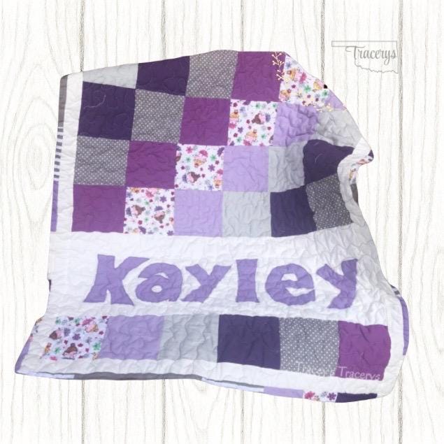 These custom appliqué name quilts are the perfect way to celebrate a little one…or a not-so-little one! Each handmade quilt features a beautifully patchworked background and a personalized name appliquéd across the front, all crafted from coordinating fabrics chosen just for you.