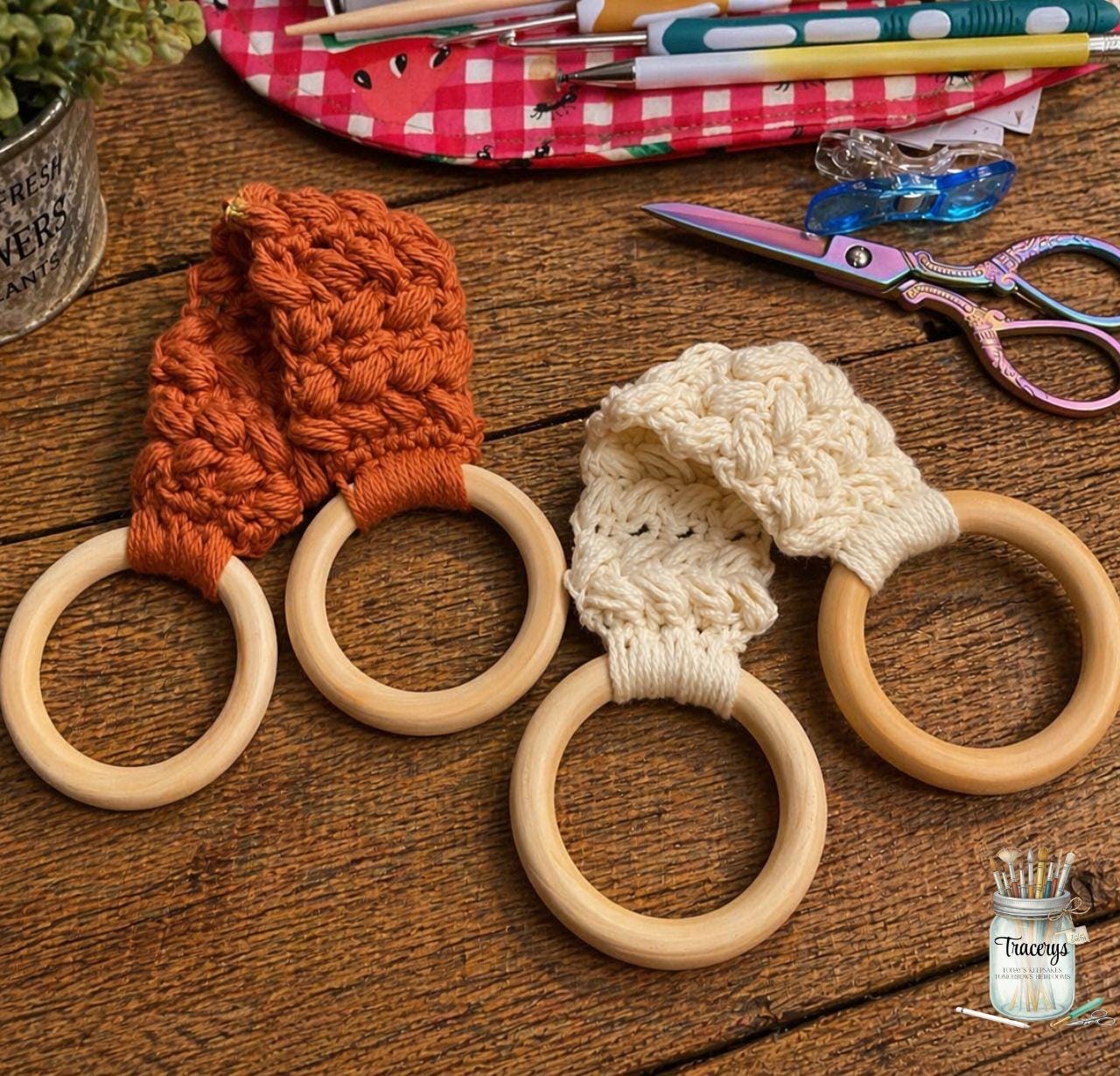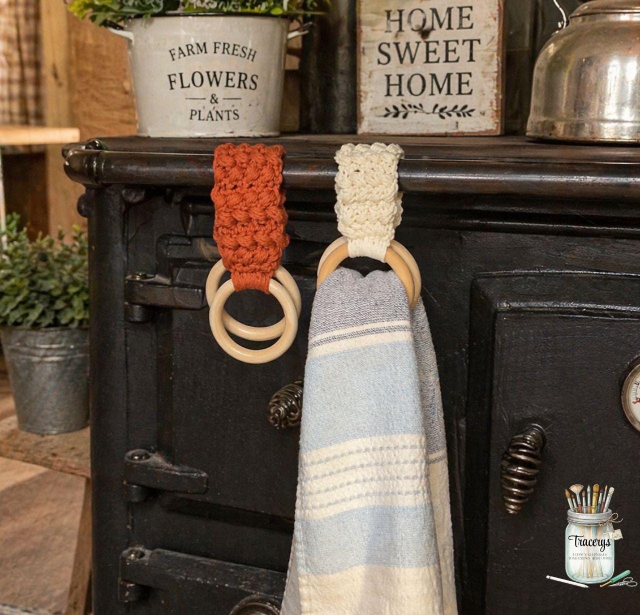 Each towel holder is crocheted by hand and finished with smooth wooden rings, making it both pretty and practical. They are perfect for hanging kitchen towels, hand towels, or decorative towels while adding a warm rustic look to your space.
