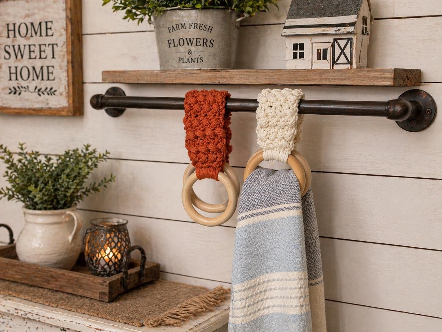 These towel holders look beautiful on a farmhouse towel bar, oven handle, cabinet pull, or wall hook. They also make a thoughtful gift for housewarmings, birthdays, weddings, or anyone who loves handmade home decor.